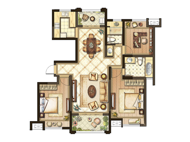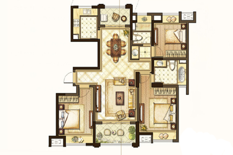 E2户型-3室2厅2卫1厨建筑面积128.00平米