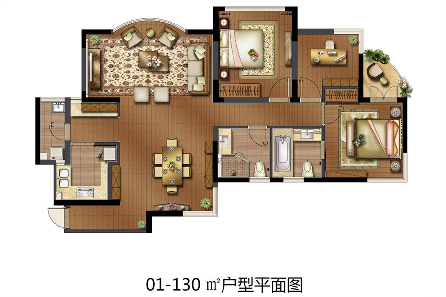 130平米户型-3室2厅2卫1厨建筑面积130.75平米
