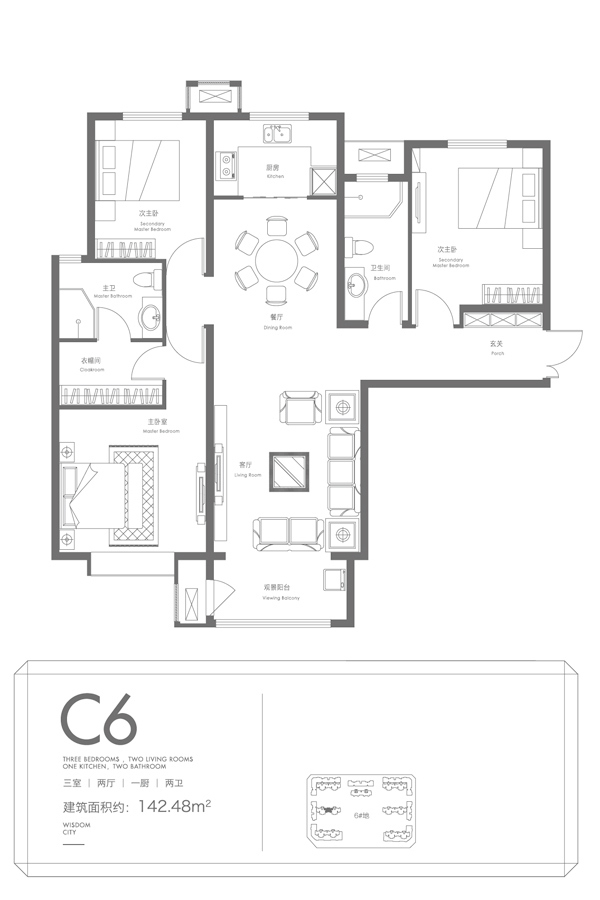 6号地块标准层C6户型-3室2厅2卫1厨建筑面积142.48平米