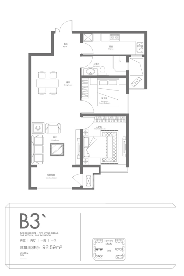 5号地和11号地B3户型-2室2厅1卫1厨建筑面积94.59平米