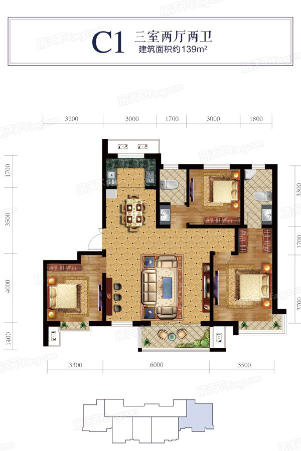 C1户型-3室2厅2卫1厨建筑面积139.00平米