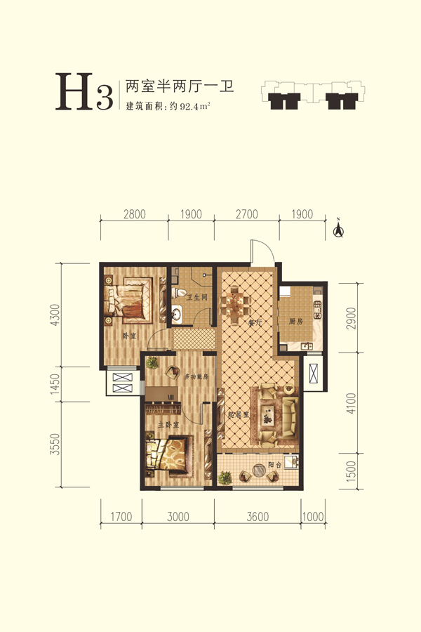北9#标准层H3户型-2室2厅1卫1厨建筑面积92.40平米