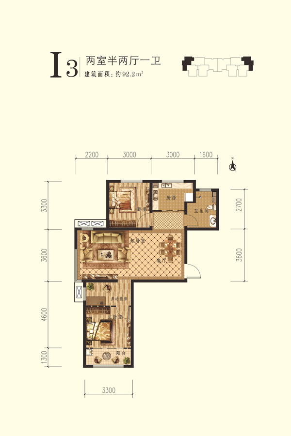 北9#标准层I3户型-2室2厅1卫1厨建筑面积92.20平米