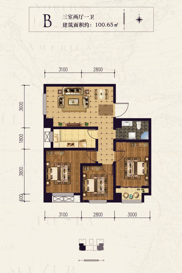 B户型-3室2厅1卫1厨建筑面积100.65平米