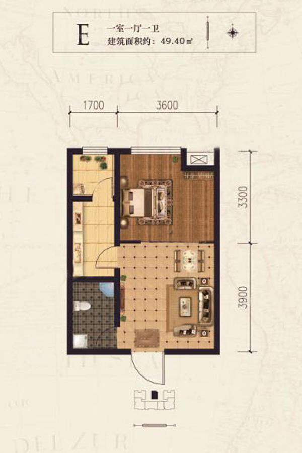 E户型-1室1厅1卫1厨建筑面积49.40平米