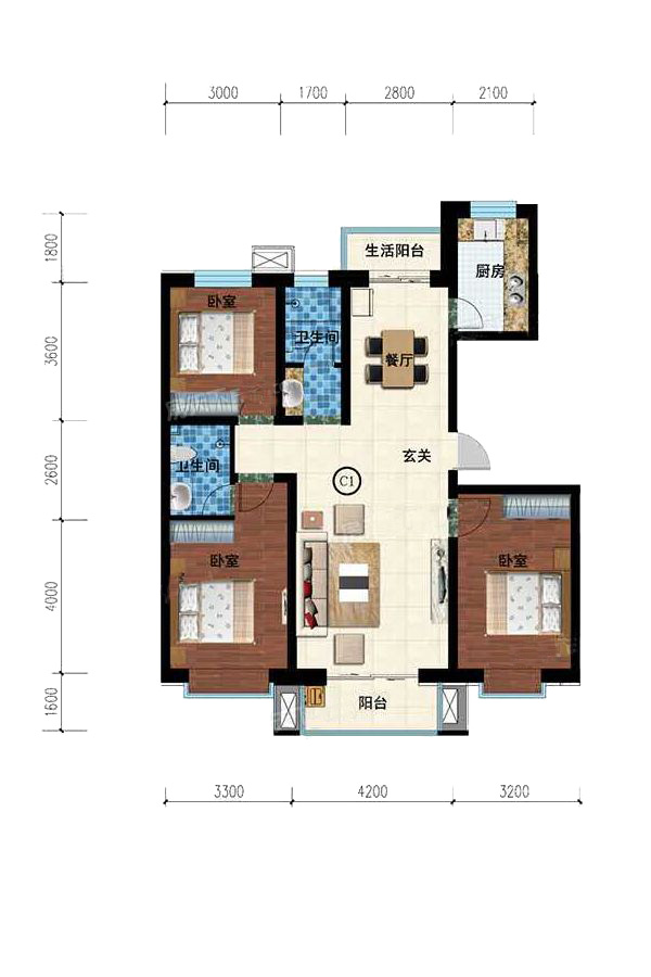 2#C1户型-3室2厅2卫1厨建筑面积133.18平米