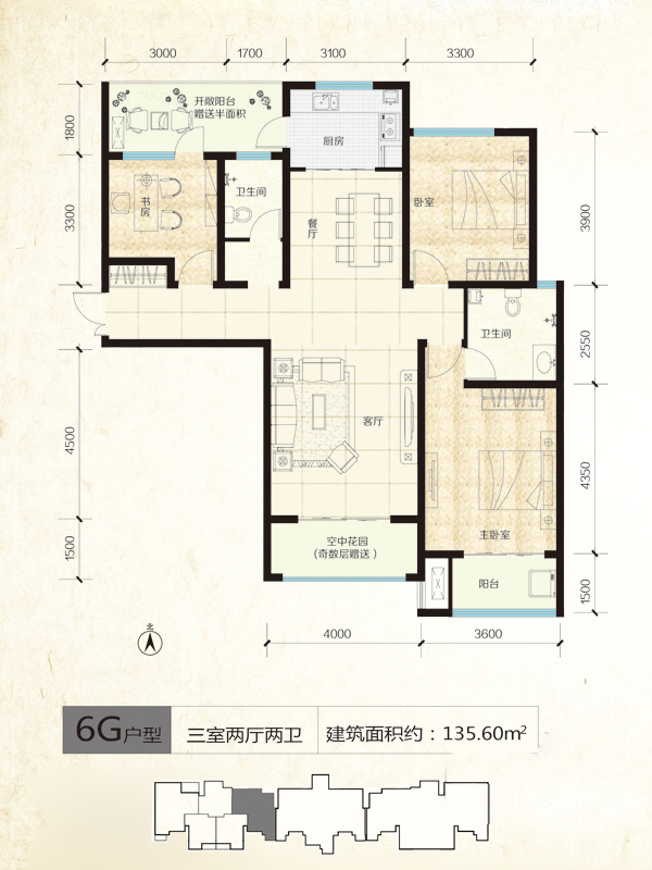 6#标准层G户型-3室2厅2卫1厨建筑面积135.60平米