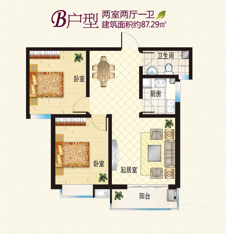 3#标准层B户型-2室2厅1卫1厨建筑面积85.93平米