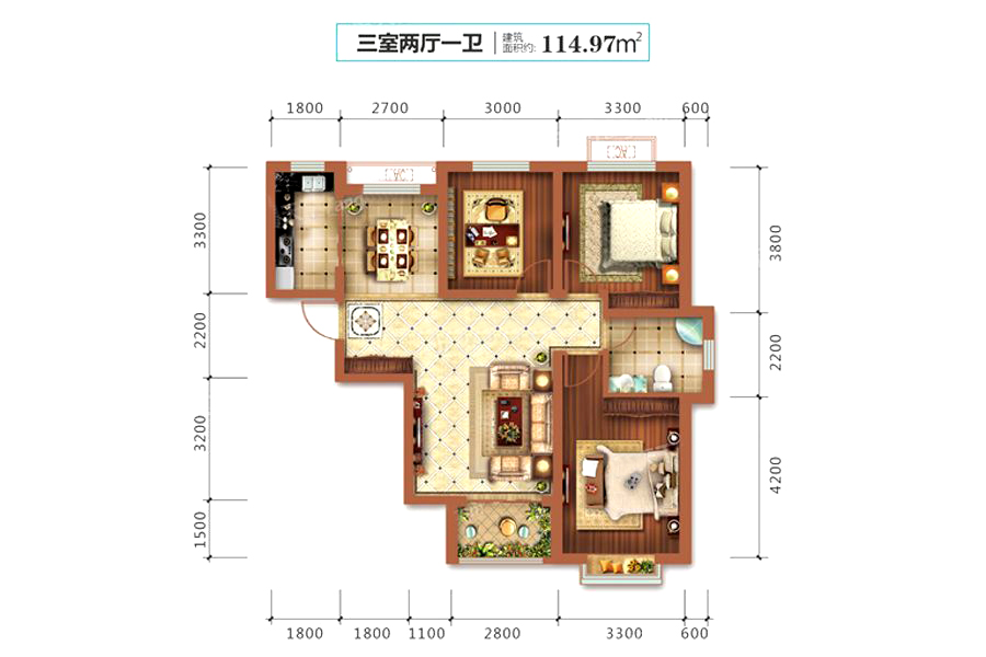 1#A1户型-3室2厅1卫1厨建筑面积114.97平米