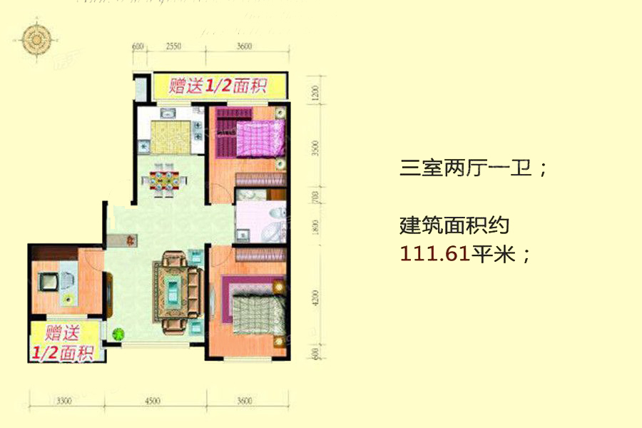111.61平户型-3室2厅1卫1厨建筑面积111.61平米