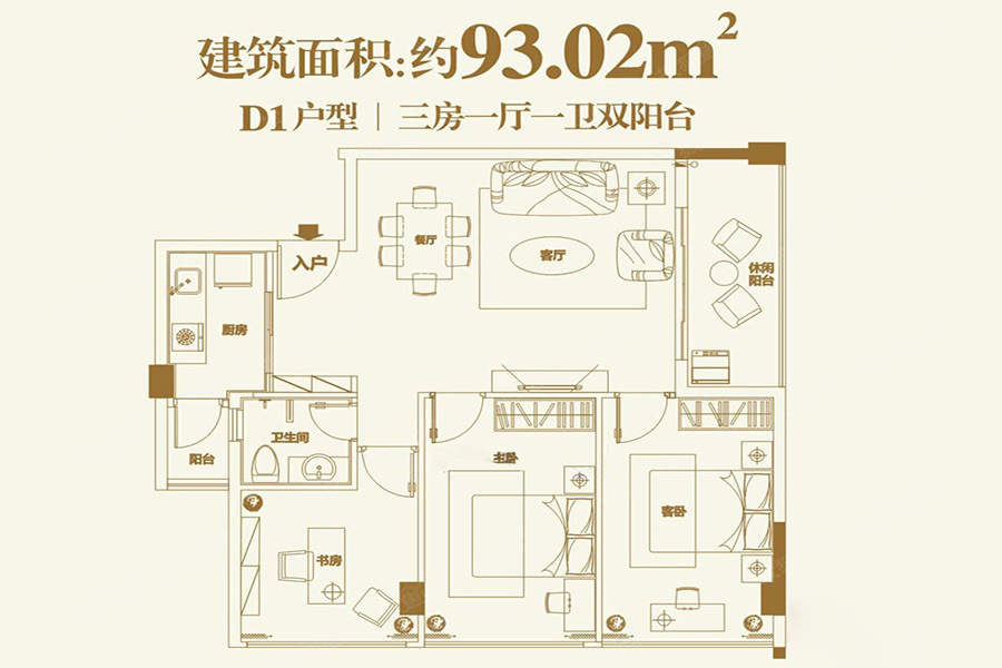 D1户型-3室1厅1卫1厨建筑面积93.02平米