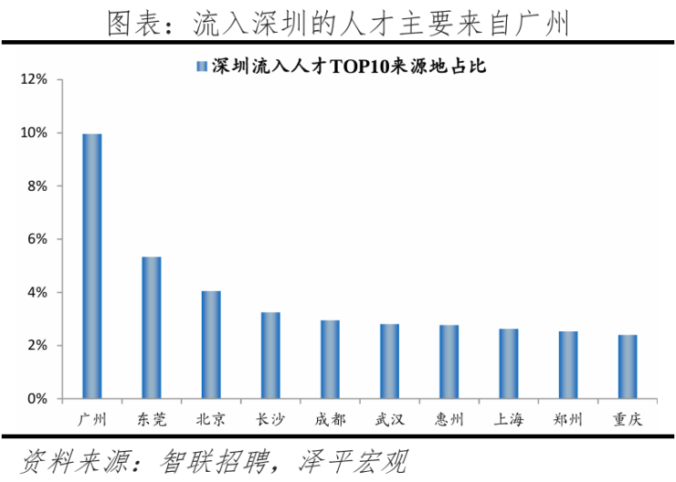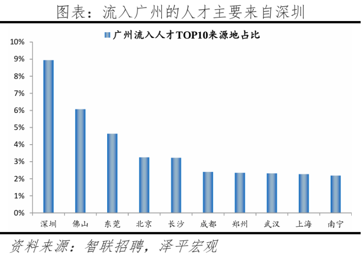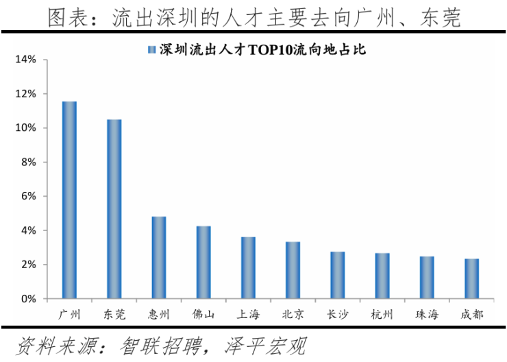 4)广州:2024年广州人才净流入小幅下降,2020-2024年人才净流入占比分别为0.9%、1%、0.7%、1.0%、0.8%,人才集聚,主因广州经济发展速度快,生活成本、房价在一线城市中较低。广州人才流向珠三角城市占比41.6%,高于北京流向京津冀、上海流向长三角城市占比,珠三角城市群人才内循环较强。