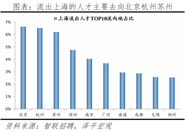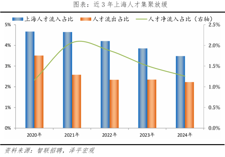 从去向看,流出上海的人才主要去向北京、杭州、苏州,2024年上海人才流向的前十大城市合计占比42.8%,低于2023年的46.6%,流出上海的人才集中度下降。其中,长三角城市增加至5个,合计占比22.3%。人才流出上海主要因为上海控制人口规模和部分产业转移,2016年上海“十三五规划”及《上海城市总体规划纲要(2015-2040)》均要求2020年及之后上海常住人口控制在2500万人以内。