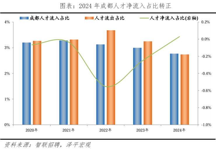 从人才流入流出看,成都人才流入、流出量均较大,2024年成都人才流入占比2.7%,人才流出占比2.7%,整体人才流动性较强。由于人才流出占比减少较多,2024年人才净流入占比转正。