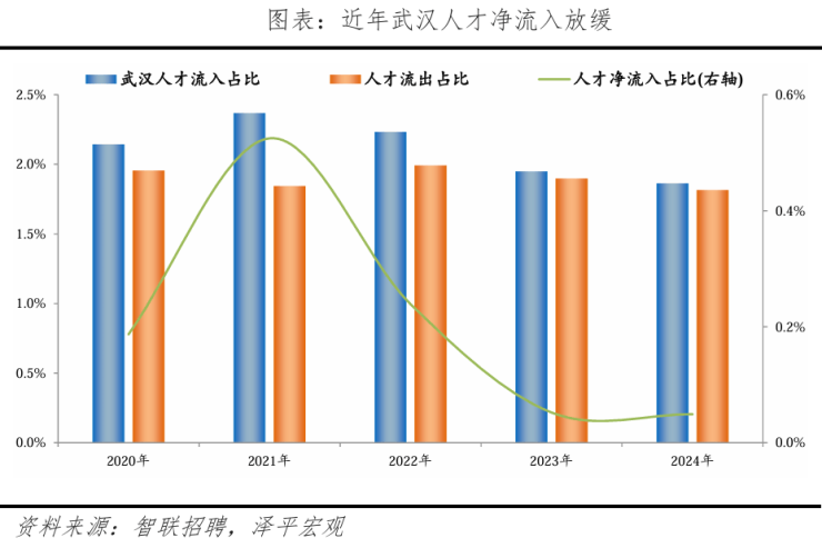 从人才流入流出看,2020-2024年武汉人才流入占比从2.1%下降至1.9%,人才流出占比从2.0%下降至1.8%,但2024年人才净流入占比依旧为正,人才呈持续净流入趋势。