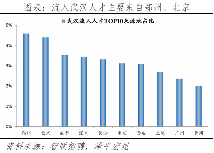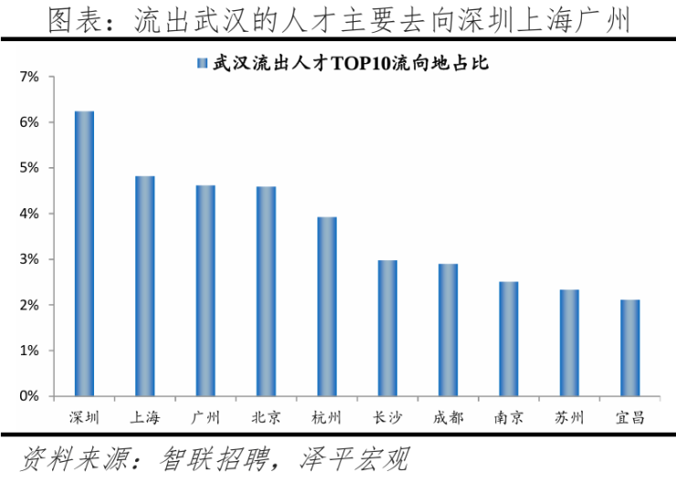 从来源看,人才流向武汉的前十大城市合计占比达32.5%,低于2023年的36.9%,人才来源地更广泛,人才来自郑州的最多,占比4.6%。人才流入武汉主要因为2017年开始实施“百万大学生留汉创业就业工程”吸引毕业生。2021年成立人才集团有限公司,专门为城市引进人才,并且武汉继续放宽落户条件,接近“零门槛”,落户开放度在国家中心城市中最大。2024年锚定“新质”荐新才,启动英才计划集中举荐等,吸引各类人才来汉就业创业。此外,作为在校大学生数量全国第三的城市,武汉留汉人才明显增加。7-8年间,留汉就业创业的大学生已超过200万,近年持续超额完成“学子留汉”工程计划(每年10万人)。从去向看,武汉人才流向的前十大城市合计占比达37%,低于2023年的39.7%。其中,前往深圳、上海、广州占比较大,分别为6.2%、4.8%、4.6%。