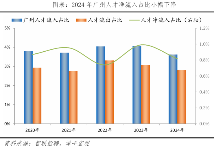 从人才流入流出看,2020-2023年广州人才流入占比从3.8%升至4.1%,但2024年小幅下滑至3.6%;人才流出占比从2.9%降至2.8%,人才集聚放缓。2024年总体人才呈净流入,占比为0.8%,较2023年下降0.2个百分点。