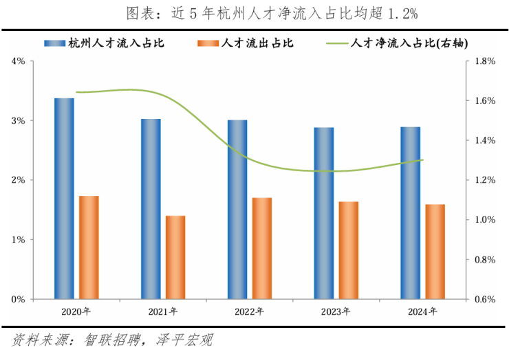 从人才流入流出看,2024年杭州全市常住人口同比增加10.2万人。人才方面,2020-2024年杭州人才流入占比较稳定,始终维持在3%左右,人才流出占比从2.0%降至1.6%,杭州留才能力较强。人才流入明显大于流出,使得人才净流入占比维持在较高水平,近5年均超1.2%。