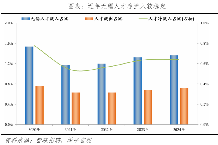 从人才流入流出看,2020-2024年无锡人才流入占比维持在1.2%-1.5%,人才流出占比维持在0.6%-0.8%,因此近年无锡人才流动性保持稳定,持续人才净流入。