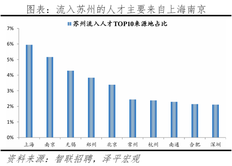 从来源看,人才流向苏州的十大城市合计占比达到34%,低于2023年的35%,来源地更广泛。其中7个城市为长三角地区城市,合计占比达到24.6%,苏州与长三角的城市人才交流较密切。人才流入主因苏州经济实力雄厚、创新发展领先,并且地处长三角腹地、距离上海最近,是资源外溢最大受益者,且制造业立市,提供大量岗位吸引人才。2024年苏州GDP为2.7万亿,居全国第六、江苏省第一,长三角地区第二;规上工业总产值4.7万亿元,稳居第2,仅次于深圳;高新技术企业超1.74万家,保持全国第4。国家级科技型中小企业达到2.43万家,保持全国第1。