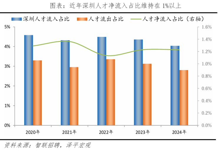 从人才流入流出占比看,2020-2024年深圳人才流入占比从4.6%降至4.0%,人才流出占比从3.3%降至2.8%,人才流动性下降。由于流入流出占比降幅相当,近年人才净流入占比保持平稳。