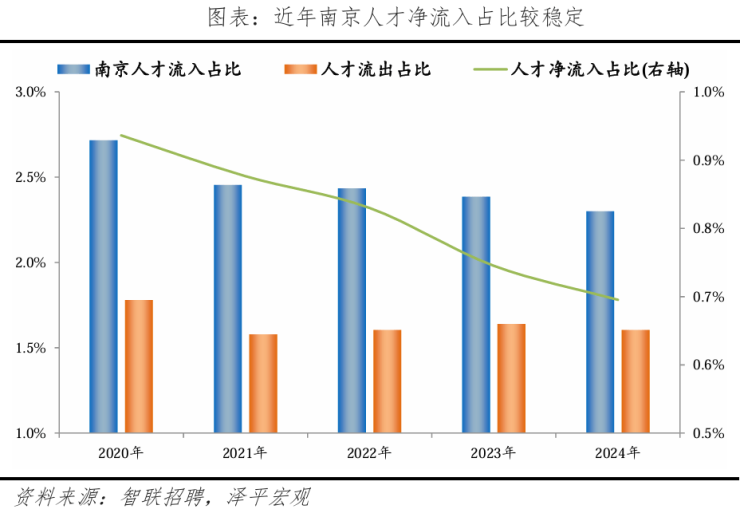 从人才流入流出看,2020-2024年南京人才流入占比从2.7%降至2.3%,人才流出占比从1.8%降至1.6%,变化幅度相对较小,使得近年南京人才净流入占比一直保持0.7%-1%的水平,基本稳定。