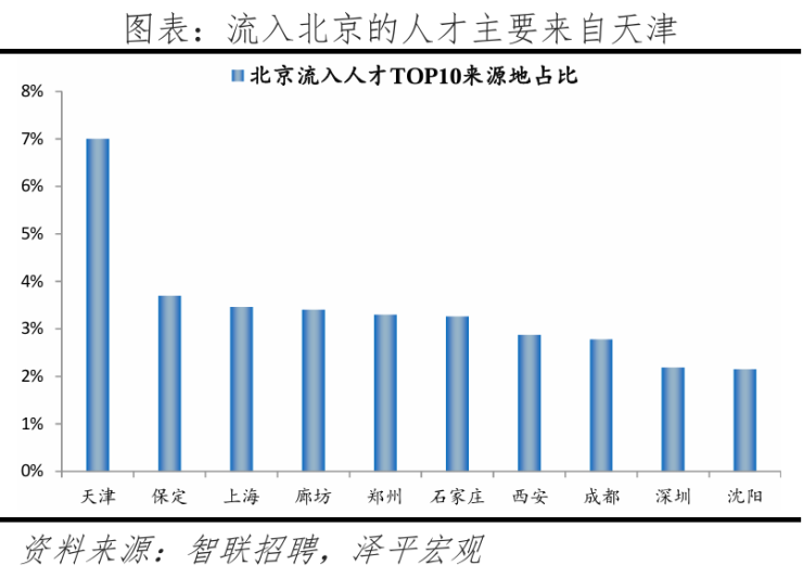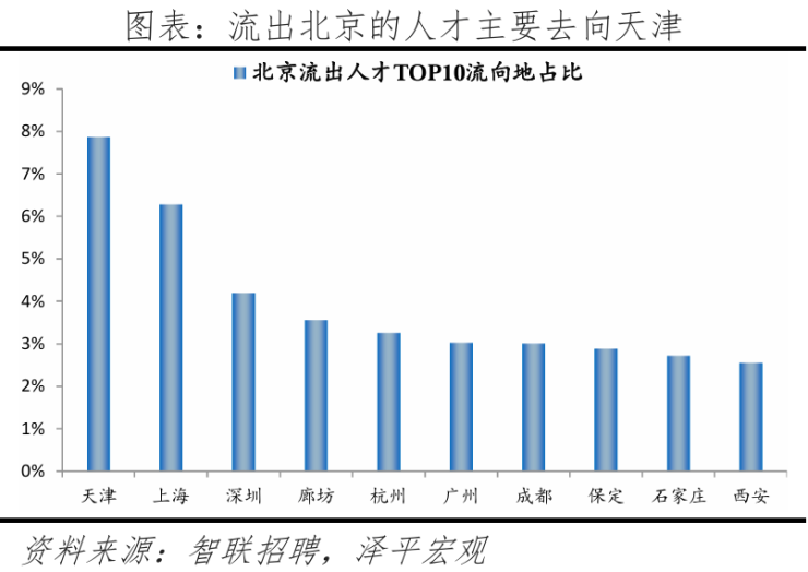 从去向看,北京人才流向的前十大城市合计占比39.3%,低于2023年的40.0%。其中,流出北京的人才中,前往天津最多,占比为7.9%,较2023年提升1.1个百分点,其次是上海。近年北京持续疏解非首都核心功能,与津冀对接协同产业。根据北京市发改委数据,近十年,累计不予办理新设立或变更登记业务超2.5万件,退出一般制造和污染企业约3200家,疏解提升区域性专业市场和物流中心近1000个。北京周边城市人才承接能力有一定提升,人才从北京流出的前十城市中津冀城市为4个,占17.0%,高于2023年的15.9%。