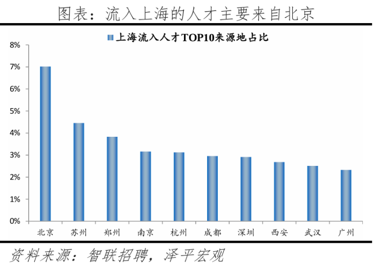 从来源看,2024年人才流向上海的前十大城市合计占比35%,低于2023年的36.1%,上海人才来源集中度继续下降。其中,长三角城市有3个,合计占比10.7%。人才流入上海主要因为其经济体量大、薪酬水平高,新经济促进政策有一定成效且上海放宽人才引进政策。2024年上海GDP规模达5.4万亿元,城镇人均可支配收入9.31万元,均位列全国第一。