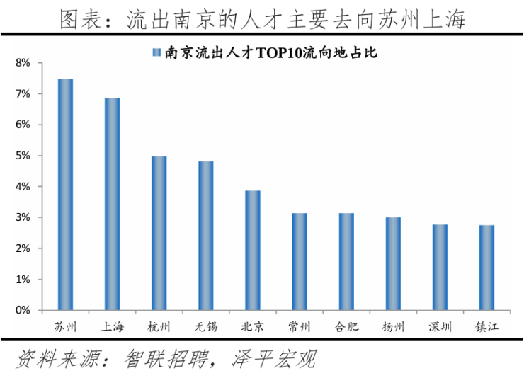 从去向看,南京人才流向的前十大城市合计占比达42.8%。其中,有8个是长三角地区,合计占比达36.2%。南京和长三角的人才互动较频繁,部分因为南京高校较多,长三角人才为求学向南京集聚,毕业后从南京回流至长三角其他城市。根据教育部数据,南京普通高校数、211高校数分别为37、12所,分别位列全国第5、3名。