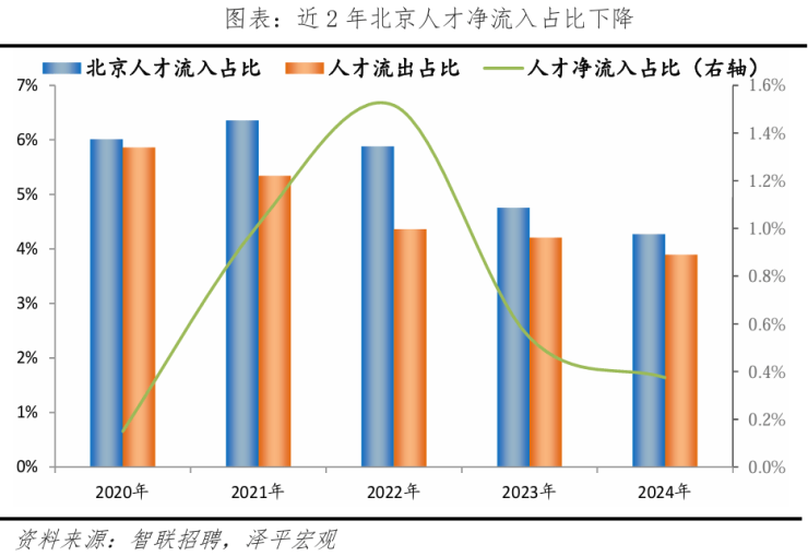 从人才流入流出看,近3年北京人才流入、流出占比明显下降,人才流动性减弱,2021-2024年人才流入占比从6.4%降至4.3%,而同期人才流出占比从5.3%降至3.9%。近年北京的人才流入、流出均居全国城市首位。 2020年后,由于人才流出明显放缓,净流出转为净流入,2022年为近年高点,2024年人才净流入占比为0.4%,较2023年下降0.17个百分点。