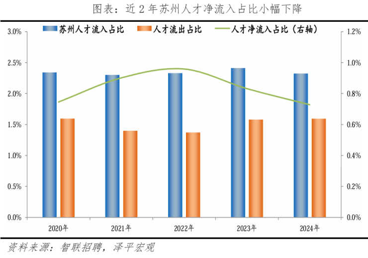 从人才流入流出看,近年苏州人才流入占比保持平稳,维持在2.2-2.4%左右,2020-2022年人才流出占比从1.6%降至1.4%,2023年回升至1.6%,由于人才流入占比下降,2024年人才净流入占比较2023年小幅下降0.1个百分点,至0.7%。