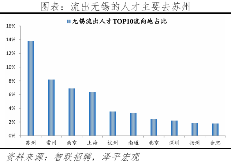 从去向看,无锡人才流向的前十大城市合计占比为50.4%,最多的是苏州,占比13.8%,流出至长三角城市有8个,合计占比45.7%,长三角区域内人才交流密切。