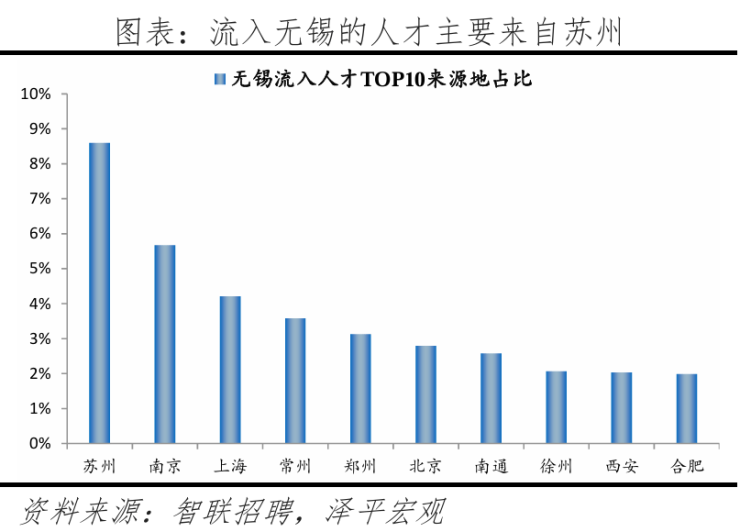 从来源看,人才流向无锡的十大城市合计占比36.6%,低于2023年的37.3%。其中长三角城市升至5个,合计占比为26.6%。人才流入无锡主要因物联网、集成电路等产业发展迅速,且为与同梯队城市相比,无锡工作机会较多,生活成本相对较小。根据无锡市政府数据,2024年物联网、集成电路等7个集群规模超2000亿元,入选国家先进制造业集群2个、累计5个;入围中国“企业、制造业、服务业、民营企业”500强榜单企业12家、23家、19家、25家,均列江苏省第一。同时,无锡引才举措较多,2016年无锡出台“太湖人才计划”,重点支持引进、培育六类产业发展重点人才,制定工作补贴、薪酬补贴、安家补贴等各项福利政策,并不断更新迭代。还采用“以赛引才”模式,针对重点产业发展方向,开办创新创业大赛,吸引海内外人才等。2024年在“中国年度最佳雇主”评选中,无锡连续第6年荣获“中国年度最佳引才城市”。2024年,无锡引进大学生10.2万人、高层次人才1.1万人。并出台《关于更大力度支持优秀青年人才来锡发展的十项措施》,发布年度重点产业紧缺人才需求目录,为人才引进提供精准指引。