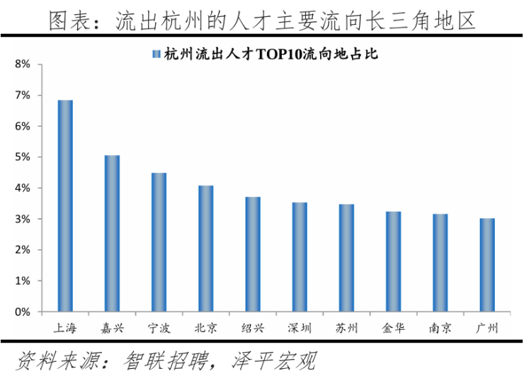 从去向看,杭州人才流向的前十大城市合计占比达40.6%。其中,有7个去向长三角地区城市,合计占比达30%,杭州人才主要向长三角地区流动,区域内交流密切。