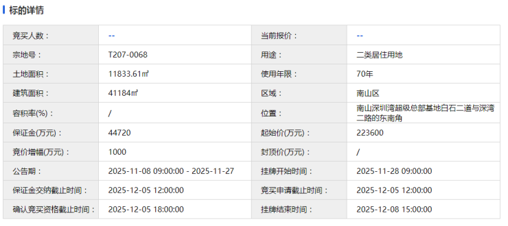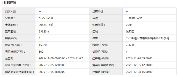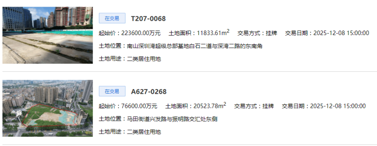 11月8日,深圳公共资源交易中心挂牌2宗宅地,一宗是位于南山深超总的T207-0068宗地;一宗是位于光明马田的A627-0268地块。