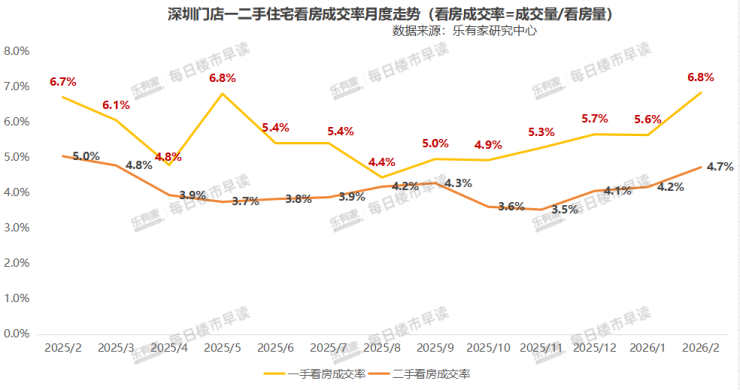 乐有家研究中心监测显示,2月深圳一手住宅看房成交率达到6.83%,二手看房成交率为4.72%。