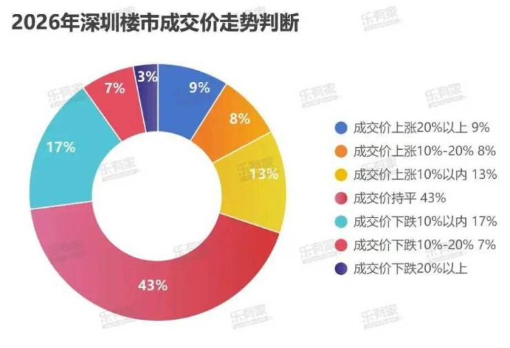 而据此前乐有家此前发起的调研结果显示,购房者对2026年深圳楼市的量价走势以“量涨价稳”为主。其中,认为成交价维稳的占比最多,占比43%,看涨的占比30%。