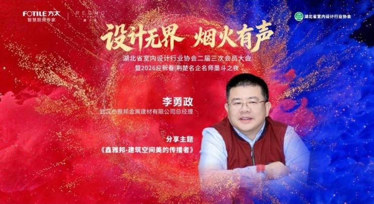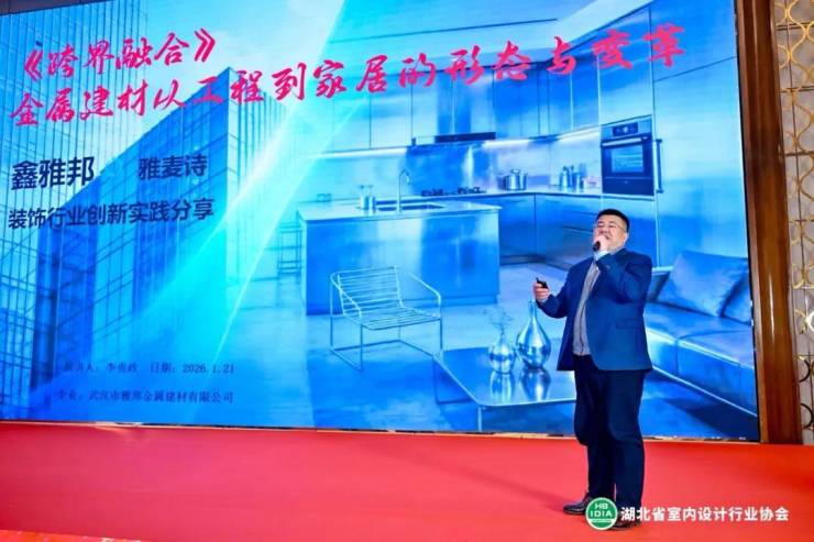 1月21 日下午,在湖北省室内设计行业协会年会现场,一篇题为《跨界融合——金属建材从工程到家居的形态与变革》的分享引发与会设计师的共鸣。本次分享由武汉市雅邦金属建材有限公司总经理李勇政主讲,以金属建材的技术革新与全流程服务视角,阐述材料升级、设计创新与项目落地之间的共生关系,并重点分享了公司如何通过 “鑫雅邦” 工程品牌积累的技术优势,孵化家居子品牌 “雅麦诗家居”,实现工程到家装服务的无缝衔接,以专业定制一体化服务为设计价值护航。