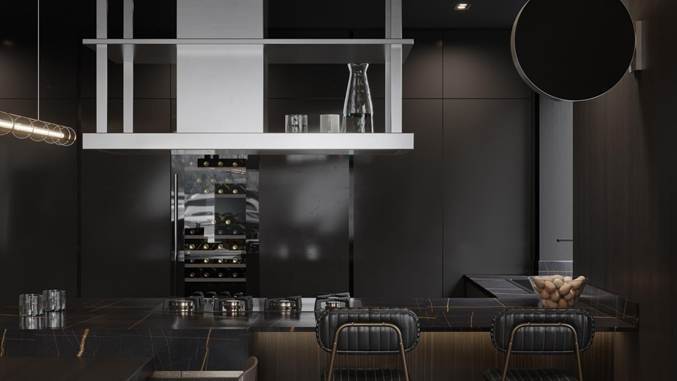 精密金属--吊灯、吧台椅腿等金属元素,体现了“当代主义”的精密与工业美感。