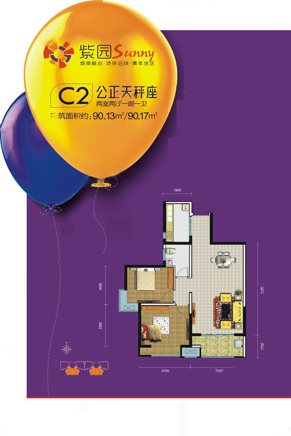 C2户型-2室2厅1卫1厨建筑面积90.13平米