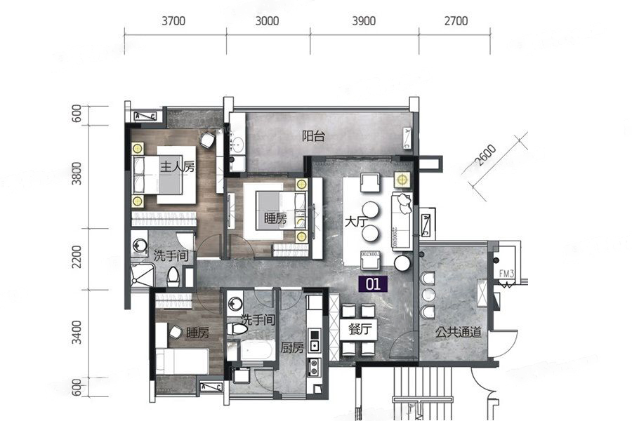 2、3栋01户型-3室2厅2卫1厨建筑面积110.85平米